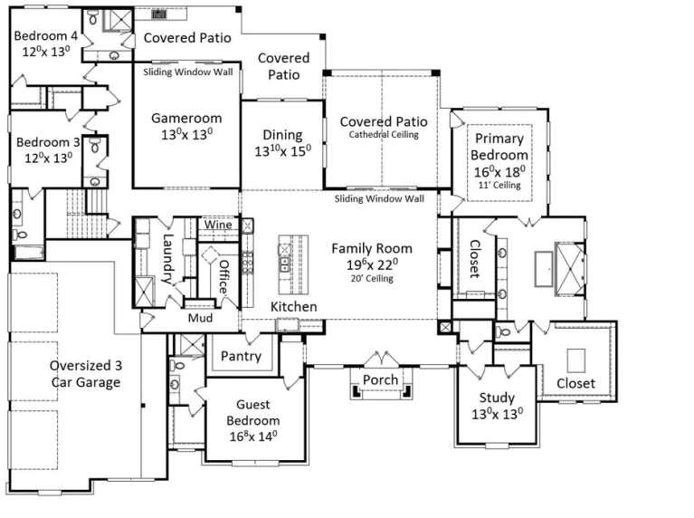 Stucco and one-story on the lake with raised study, game room, 2-story family room, mud room, 3 car garage, 2-story and 1-story covered porches.